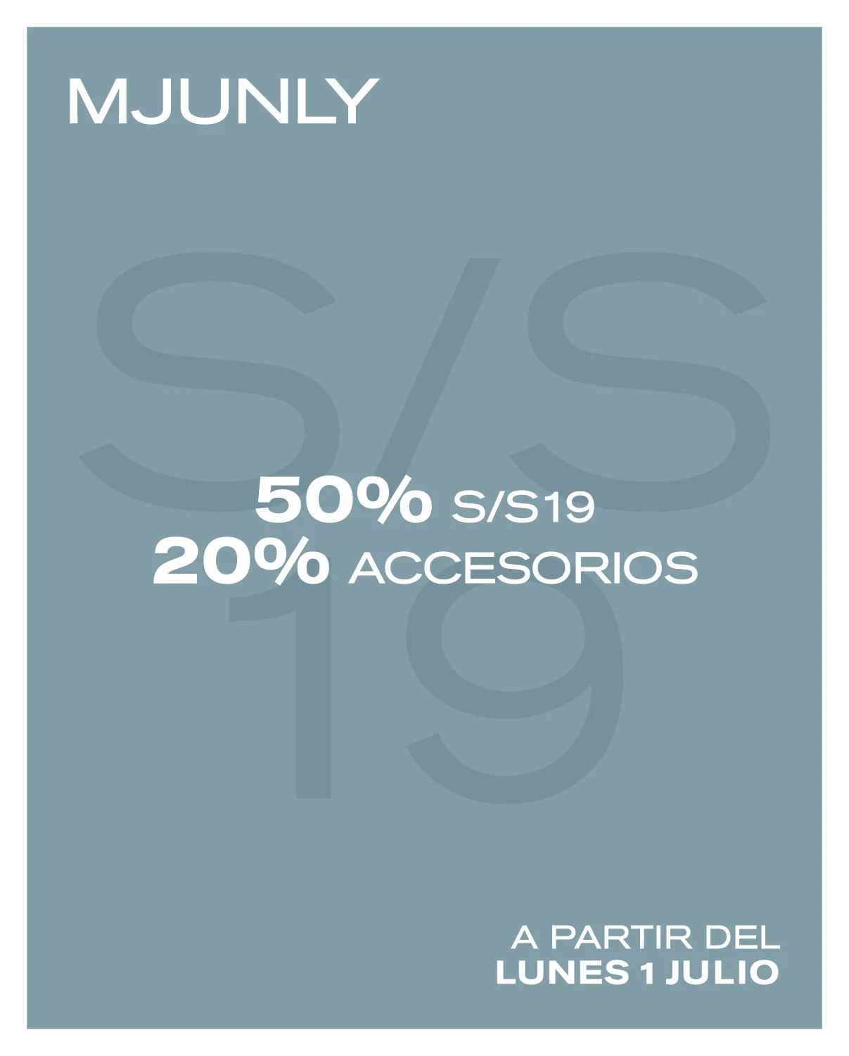A partir del próximo lunes 1 de Julio, te esperamos en nuestro espacio, con descuentos del 50% en SS19 y 20% en accesorios, ¡Feliz verano!